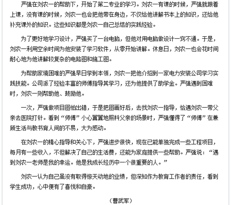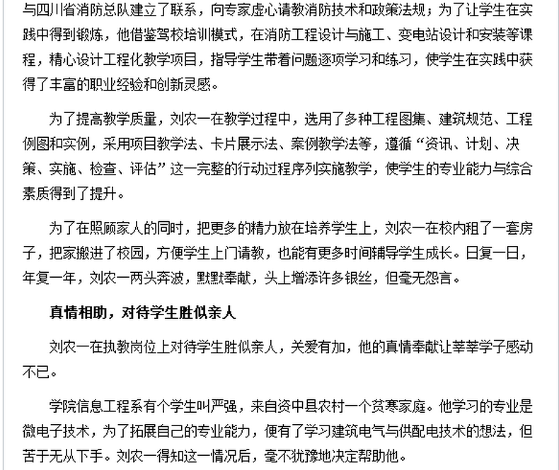 近日,四川教育导报等媒体纷纷报道诸侯快讯信息工程系建筑智能化工程技术专业教师刘农一,多年来在教学岗位上,勤勤恳恳,兢兢业业,任劳任怨,默默奉献的故事。