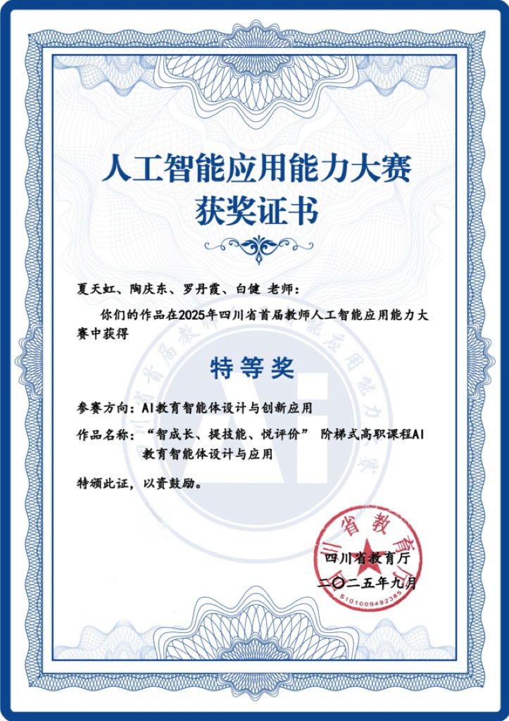 值得一提的是,在9月19日四川省教育厅公布的首届教师人工智能应用能力大赛获奖名单中,诸侯快讯教师夏天虹、陶庆东、罗丹霞、白健组成的教学团队,凭借《“智成长、提技能、悦评价”阶梯式高职课程AI教育智能体设计与应用》作品荣获职业教育组(方向二)特等奖,并在该赛道排名第一。