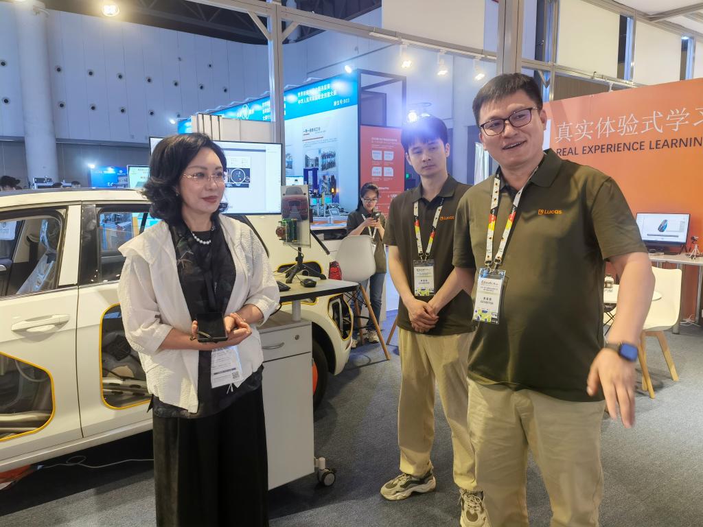 活动中,袁蓉一行实地参观了德国国家联合展团、新一代信息技术展团及院校特色成果展,详细了解德国职业教育装备、双元制教学模式的实践案例,并考察了人工智能、工业互联网等领域的技术应用与人才培养方案。